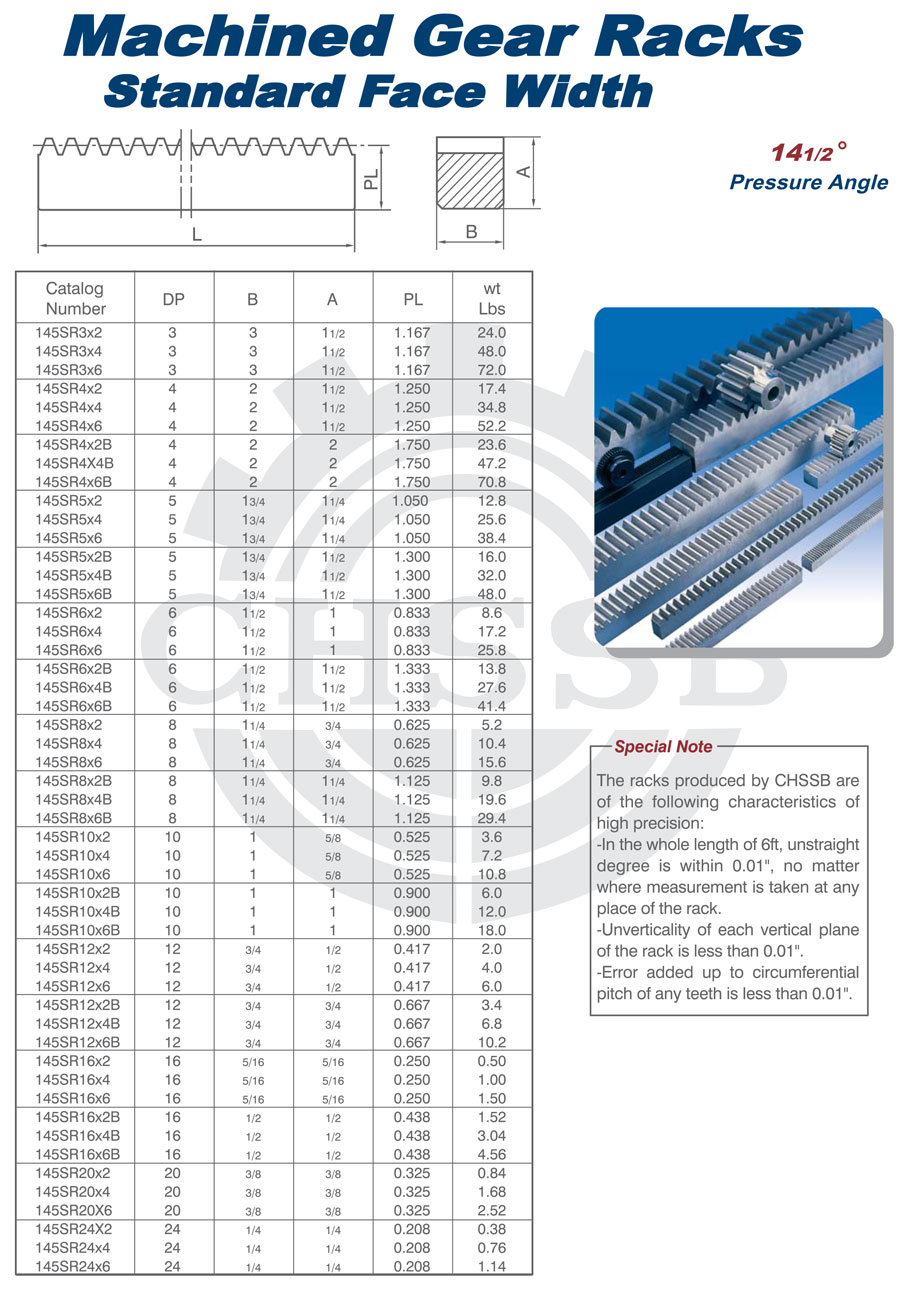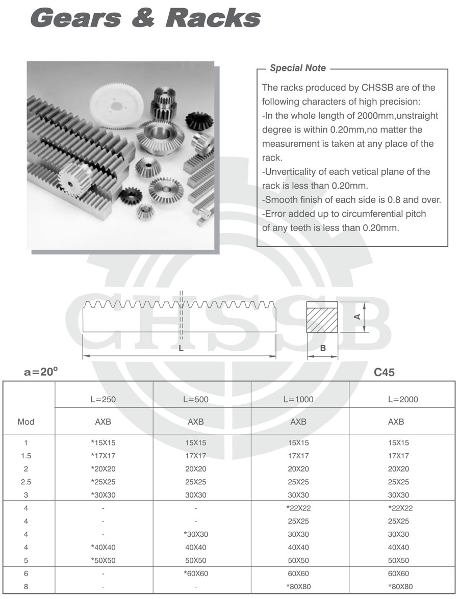 產(chǎn)品范圍: 美標(biāo):(14 1/2°/20°) 歐標(biāo):(Mod.1-6) 英制尺寸產(chǎn)品(適用于美標(biāo)市場(chǎng)) 公制尺寸產(chǎn)品(適用于歐標(biāo)市場(chǎng)) 斜齒條 圓齒條 斜齒齒條 圓齒齒條 SB型齒條 直齒條、牙條、工業(yè)齒條、正齒條
