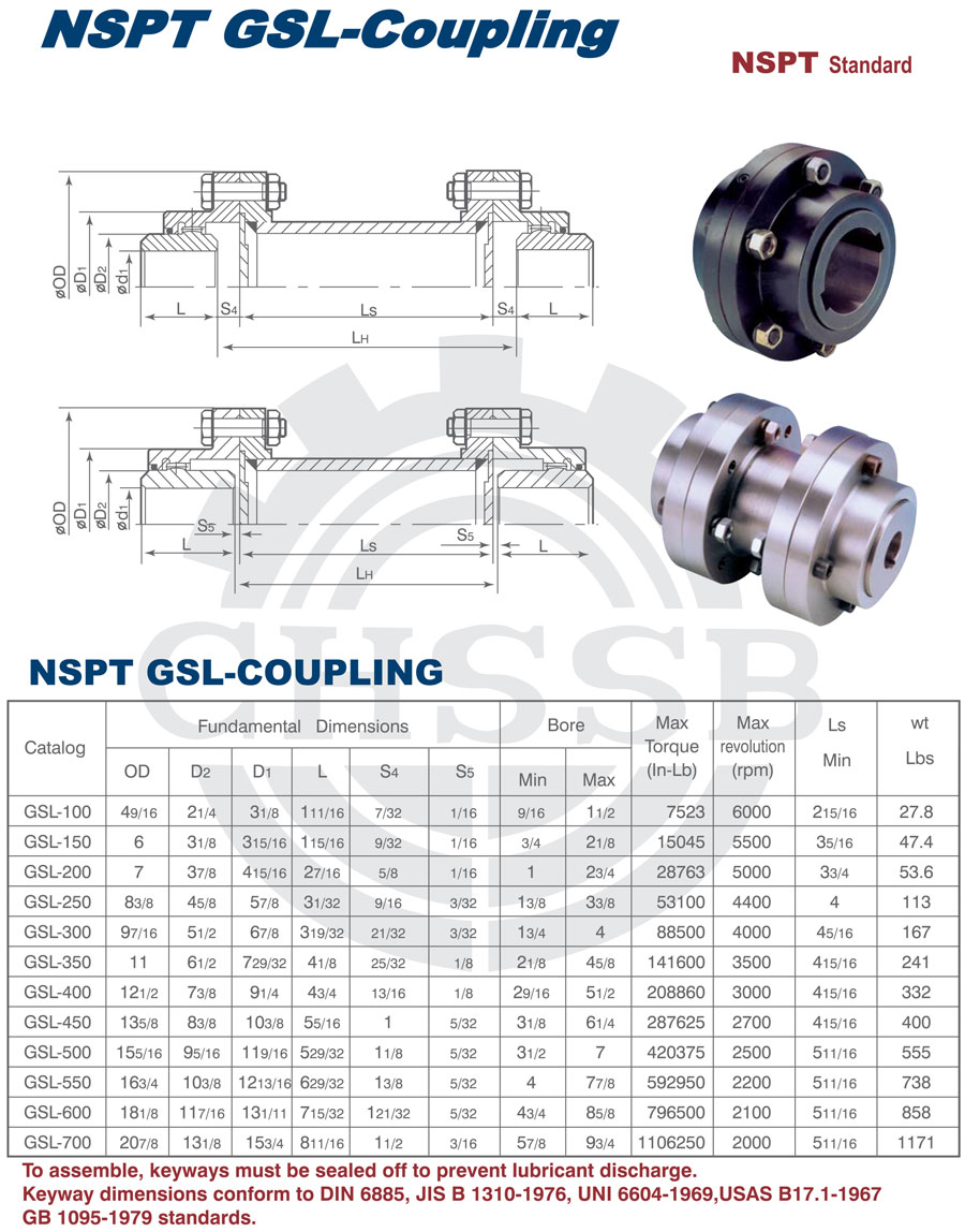 產(chǎn)品范圍: 美標(biāo)/歐標(biāo):(GSL) 英制尺寸產(chǎn)品(適用于美標(biāo)市場) 公制尺寸產(chǎn)品(適用于歐標(biāo)市場) GSL型聯(lián)軸器